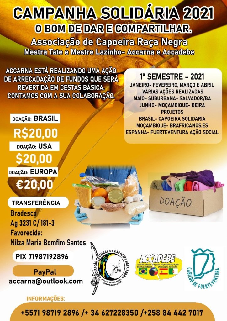 Campanha Solidária Associação de Capoeira Raça Negra. Colaboração para amenizar os impactos da pandemia.